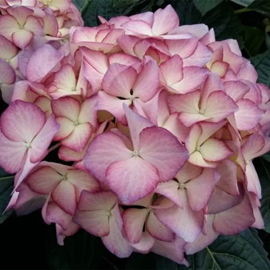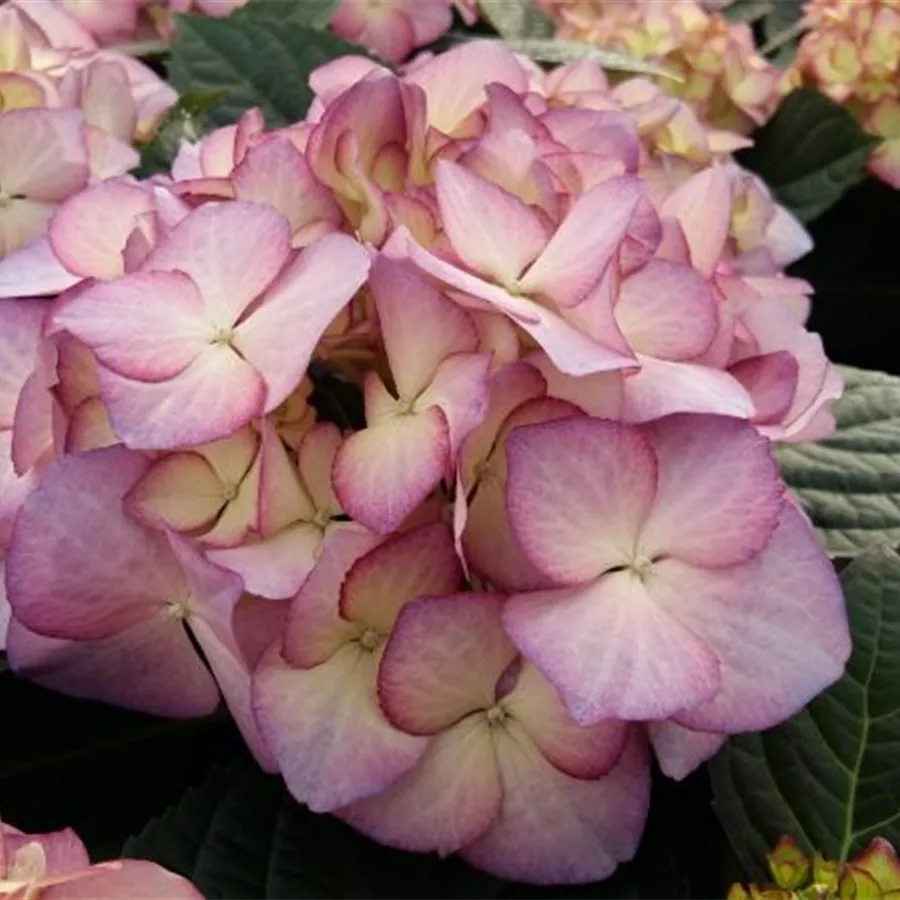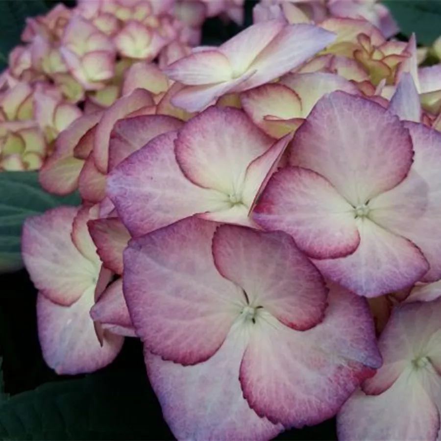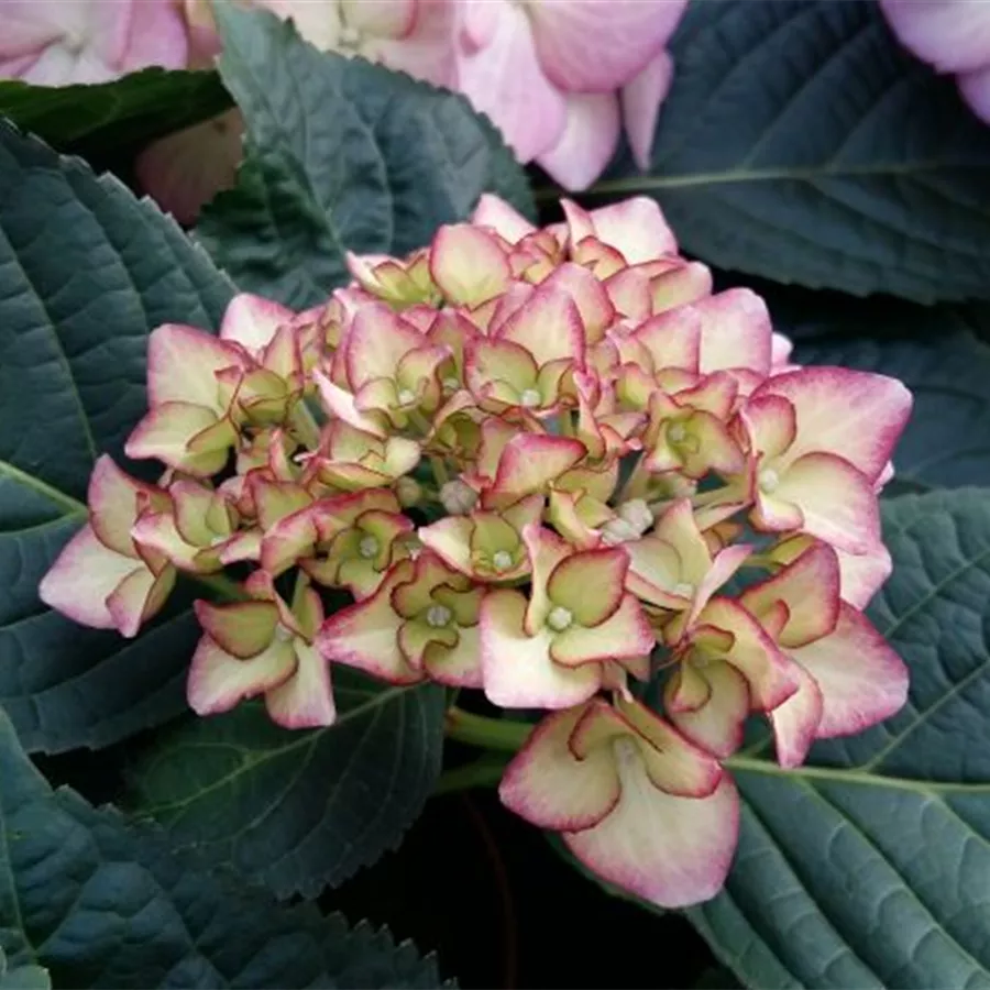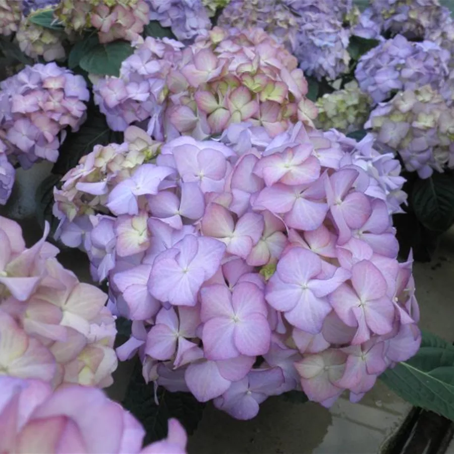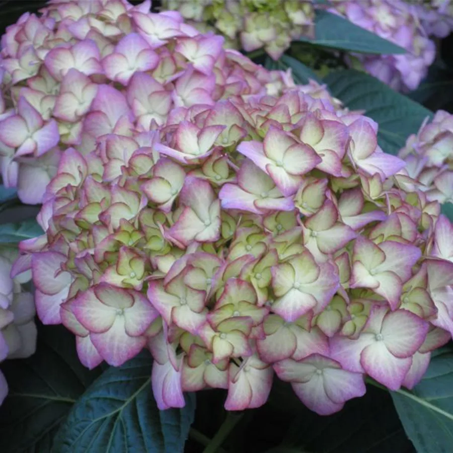 Ihre Blüten sind ballförmig angeortnet und erstrahlen in einem creme, welches in den Blütenspitzen in ein zartes lila übergeht. In voller Blüte, blüht sie in einem flieder-lila.Die Bauernhortensie 'Adula' lila hat große ballförmige Blütenstände, die grün mit einem rotvioletten Rand aufblühen und sich rosaviolett bis hellviolett entwickelt. Zum Herbst hin nimmt die Blüte eine hellgrüne bis dunkelgrüne Färbung, mit violetter Umrandung an. Blütezeit von Juni bis Oktober.