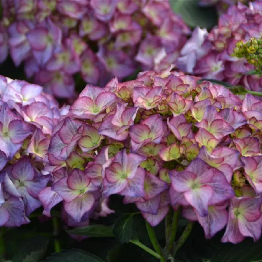 Die Bauernhortensie 'Adula' lila hat große ballförmige Blütenstände, die grünlich mit rotviolettem Rand aufblühen und sich rosaviolett bis hellviolett entwickelt. Zum Herbst hin nimmt die Blüte eine hellgrüne bis dunkelgrüne Färbung mit violetter Umrandung an. Blütezeit von Juni bis Oktober.