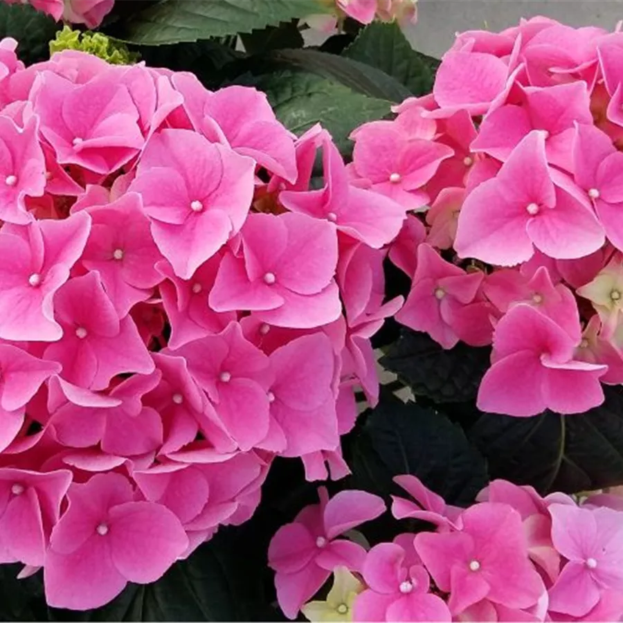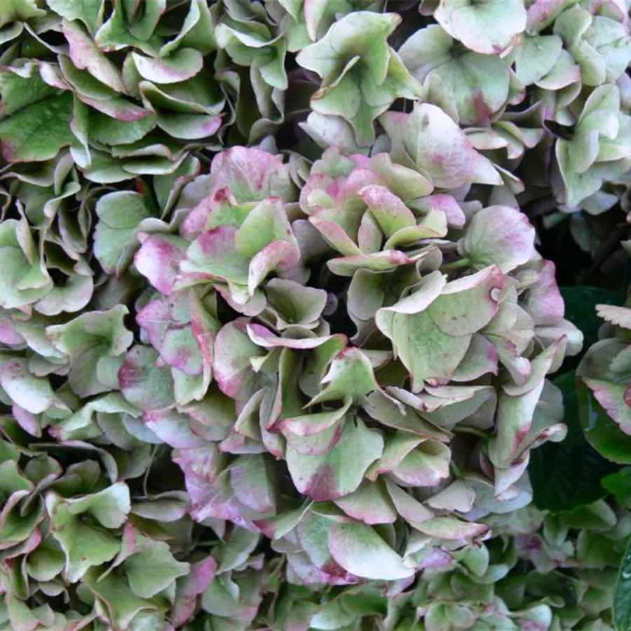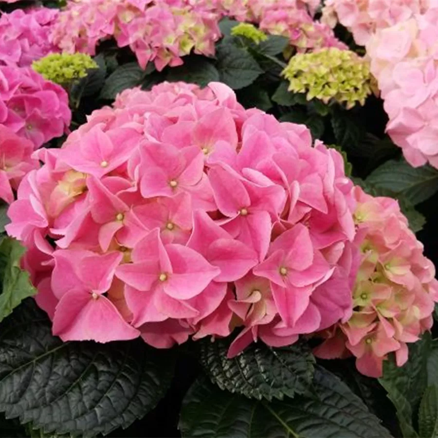 Die Bauernhortensie 'Early Pink' hat ballförmige Blütenstände, die sich anfangs grünrosa zeigen und in voller Blüte rosa bis pink erscheinen. Zum Herbst hin nimmt die Blüte eine dunkelgrüne Färbung mit roter Abtönung an. Blütezeit von Juni bis Oktober.