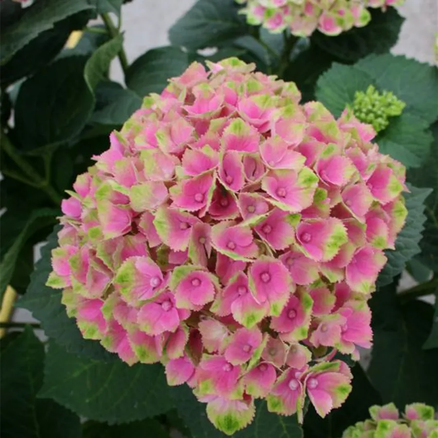 Sehr feste rosa farbene Blüten mit grüner Zeichnung, im Verlauf der Blütenphase werden die Blüten ganz grün, unter günstigen Bedingungen färben sie weiter im Herbst in rot.Die Bauernhortensie 'Magical Amethyst'®-rosa hat kräftige ballförmige Blütenstände, die von Juni bis Oktober blühen. Die einzelnen Blütenblätter sind leicht zugespitzt und fühlen sich wie Wachs an. Ihre verschiedenen Blüh-Phasen verzaubern bei jedem Farbwechsel Im Aufblühen zeigt sie sich reingrün, danach mit rosa bis pinke Zeichnung. Zum Herbst hin nimmt wieder die grüne bis dunkelgrüne Farbe überhand, die später eine tiefe kirschrote Abtönung kriegt.