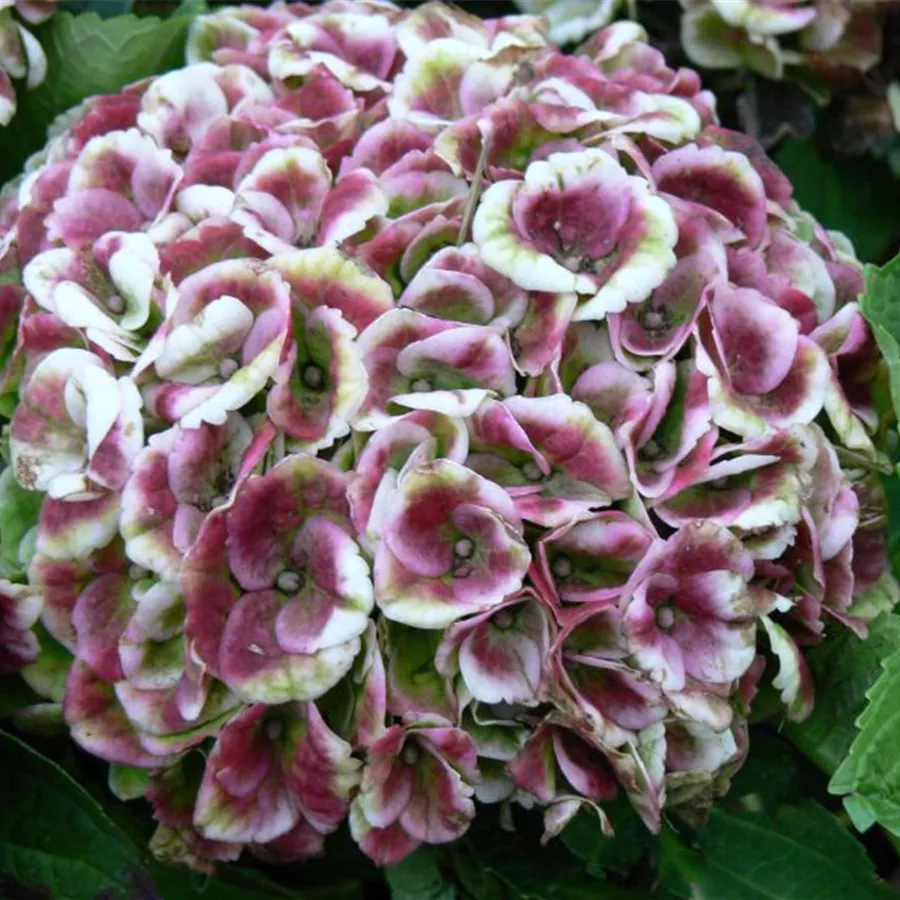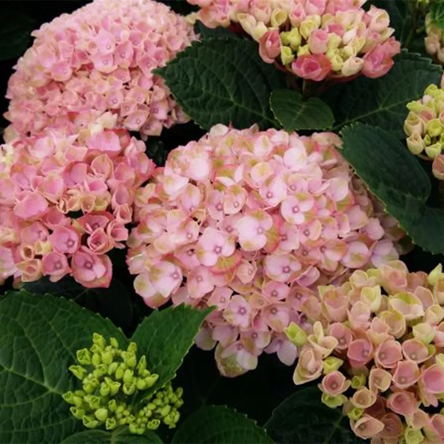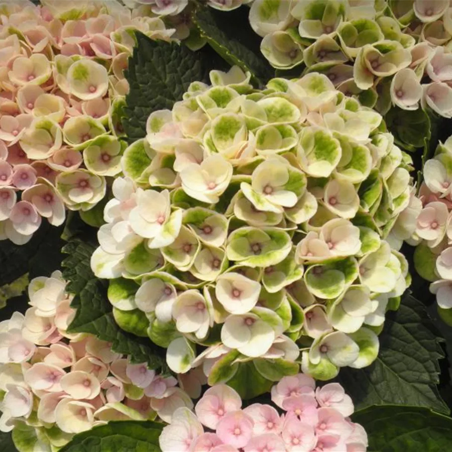 Eine sehr gut winterharte Sorte. Magical Revolution rosa ist ein wares Farbenspiel. Sie blüht in zartem rosa, über weiß, grün bis hin zu einem kräftigen rot und grün in der Herbstfärbung.Die Bauernhortensie 'Magical Revolution'®-rosa hat kräftige ballförmige Blütenstände, die von Juni bis Oktober blühen. Die einzelnen Blütenblätter sind leicht zugespitzt und fühlen sich wie Wachs an. Ihre verschiedenen Blüh-Phasen verzaubern bei jedem Farbwechsel Im Aufblühen zeigt sie sich rosa, dann kommt eine hellgrüne bis grüne Zeichnung. Danach ändert sich die rosa Farbe in eine blassrosa, fast weiße Farbe, die nachher noch eine tiefe rote Abtönung kriegt.
