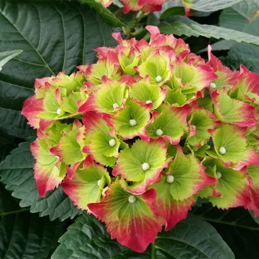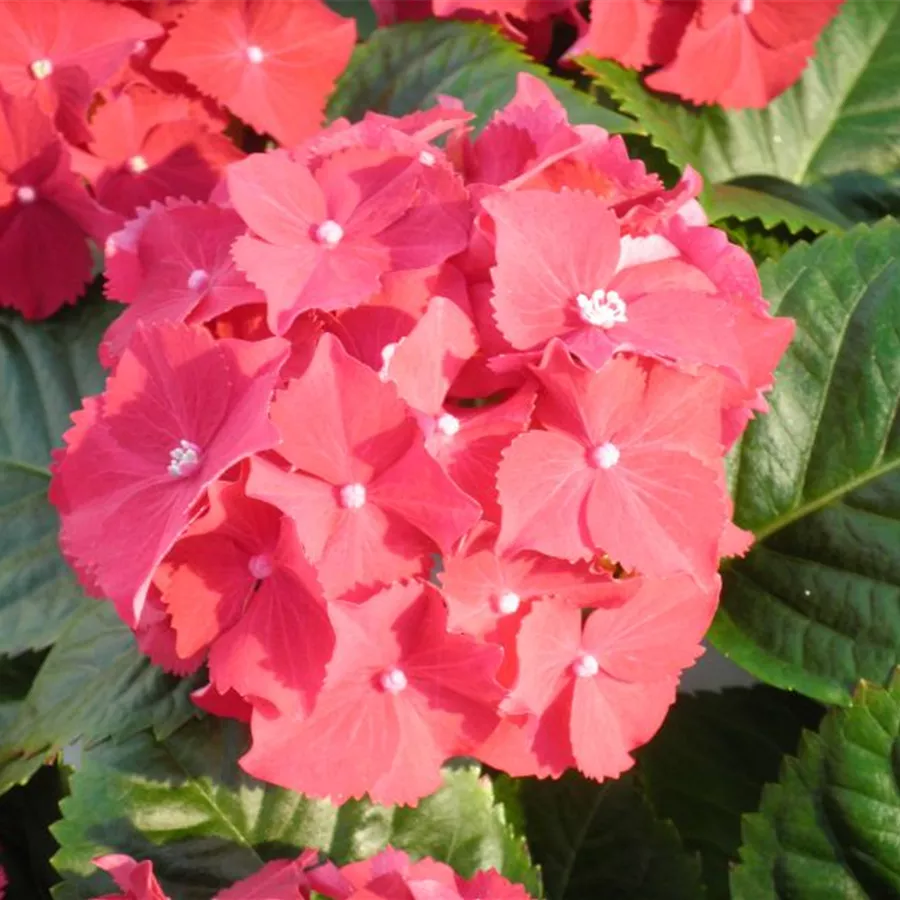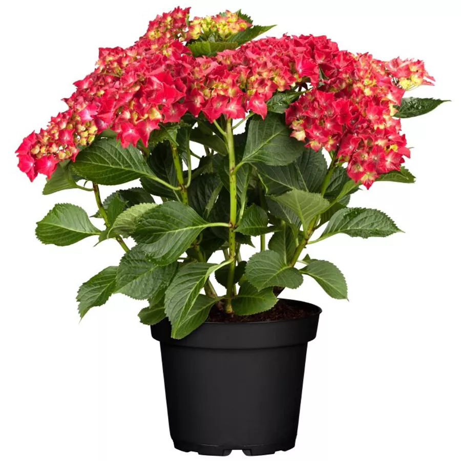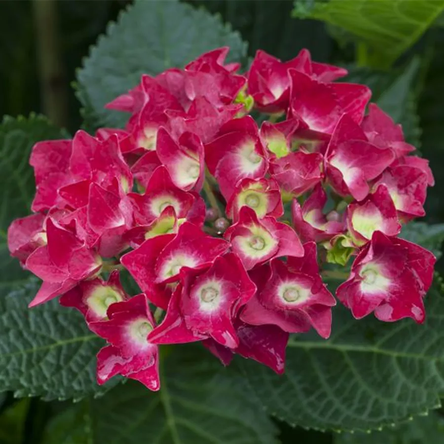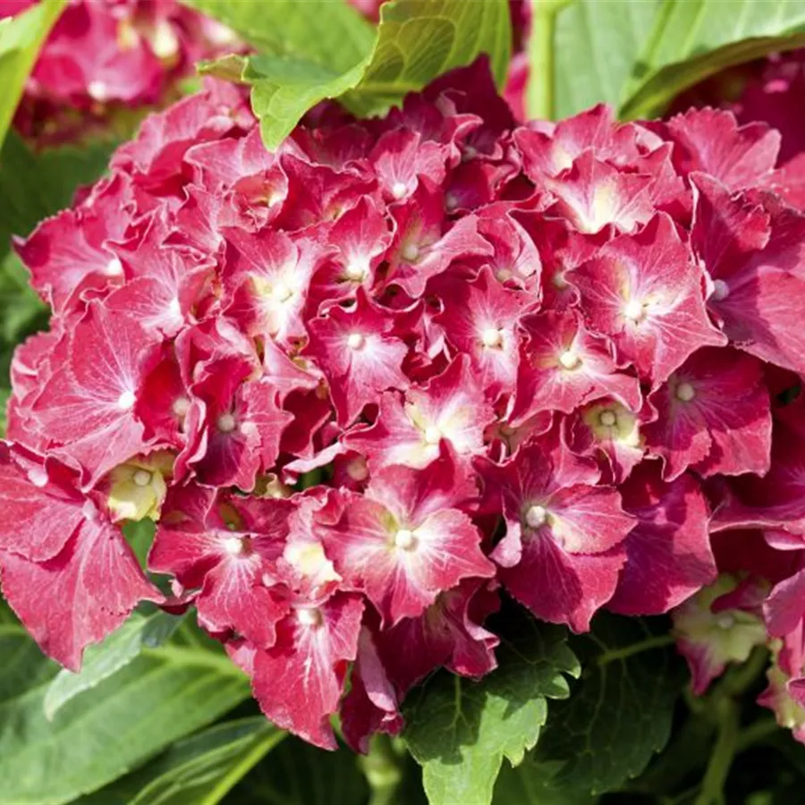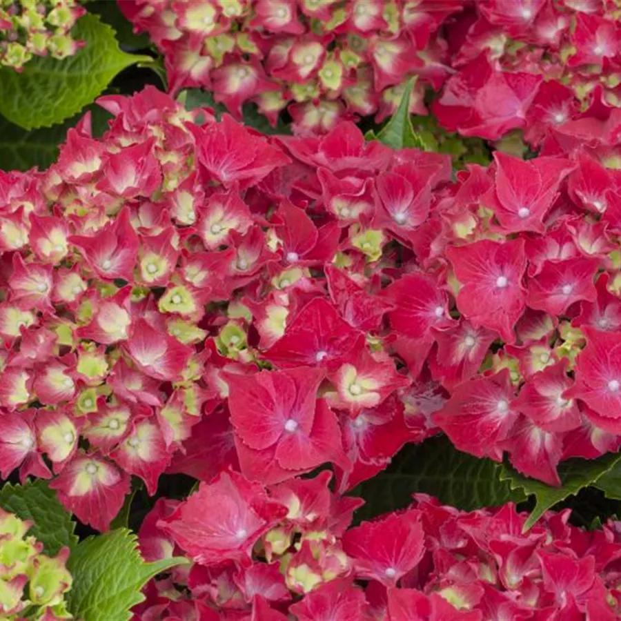 Mit ihren dunkelrot leuchtenden Blütendolden, sticht diese Sorte ins Auge. Ihr mittelgrünes Laub und der gut verzweigte Wuchs runden diese Ballhortensie ab.Die Bauernhortensie 'Royal Red'® hat ballförmige Blütenstände, die sich anfangs grünrot, dann tiefrot bis leuchtendrot zeigen. Zum Herbst hin nimmt die Blüte eine dunkelgrüne Färbung, mit roter Abtönung an. Blütezeit von Juni bis Oktober.