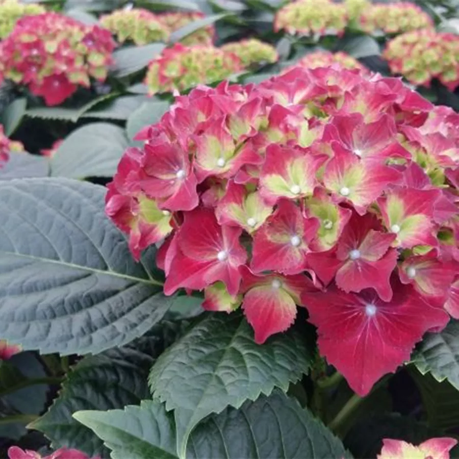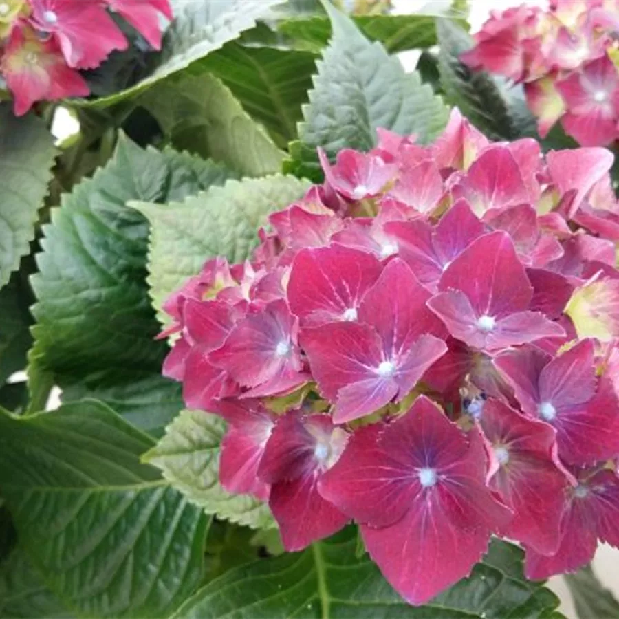 Die Bauernhortensie 'Royal Red'®-blau hat ballförmige Blütenstände, die sich tiefrot bis violettrot zeigen und einen schönen blauen „Knopf“ in den einzelnen Blüten besitzen. Zum Herbst hin nimmt die Blüte eine dunkelgrüne Färbung, mit violetter Abtönung an. Blütezeit von Juni bis Oktober.