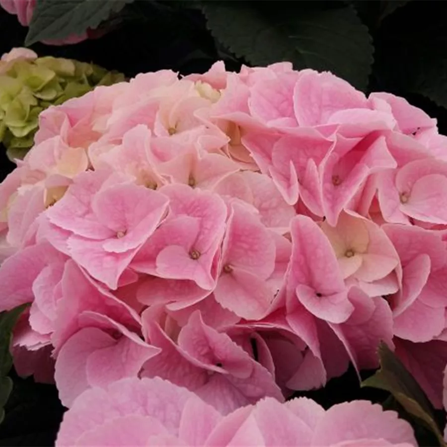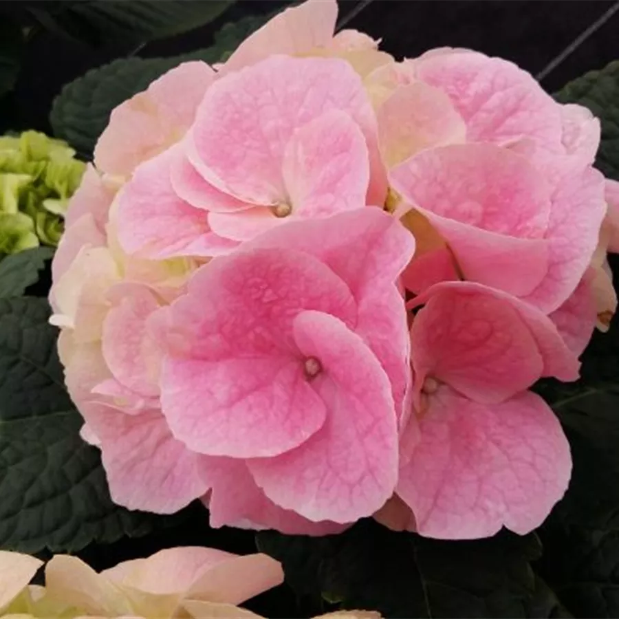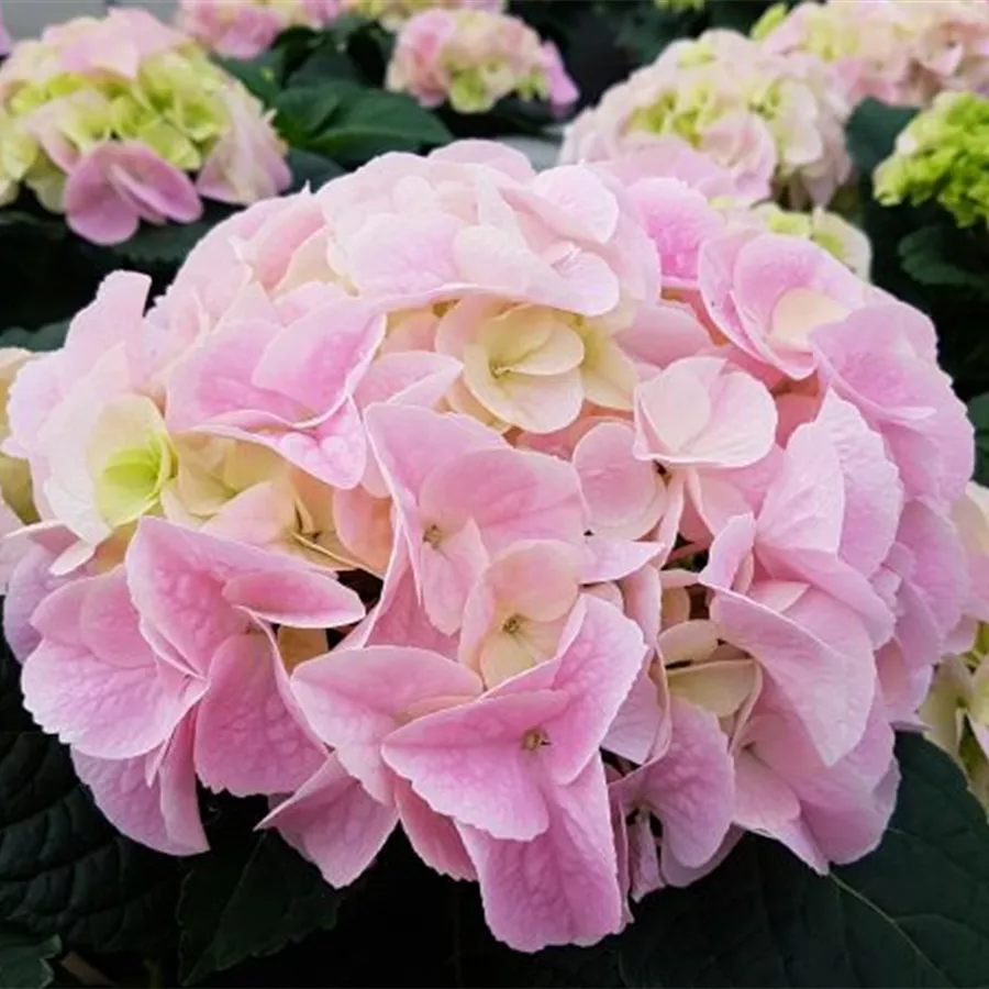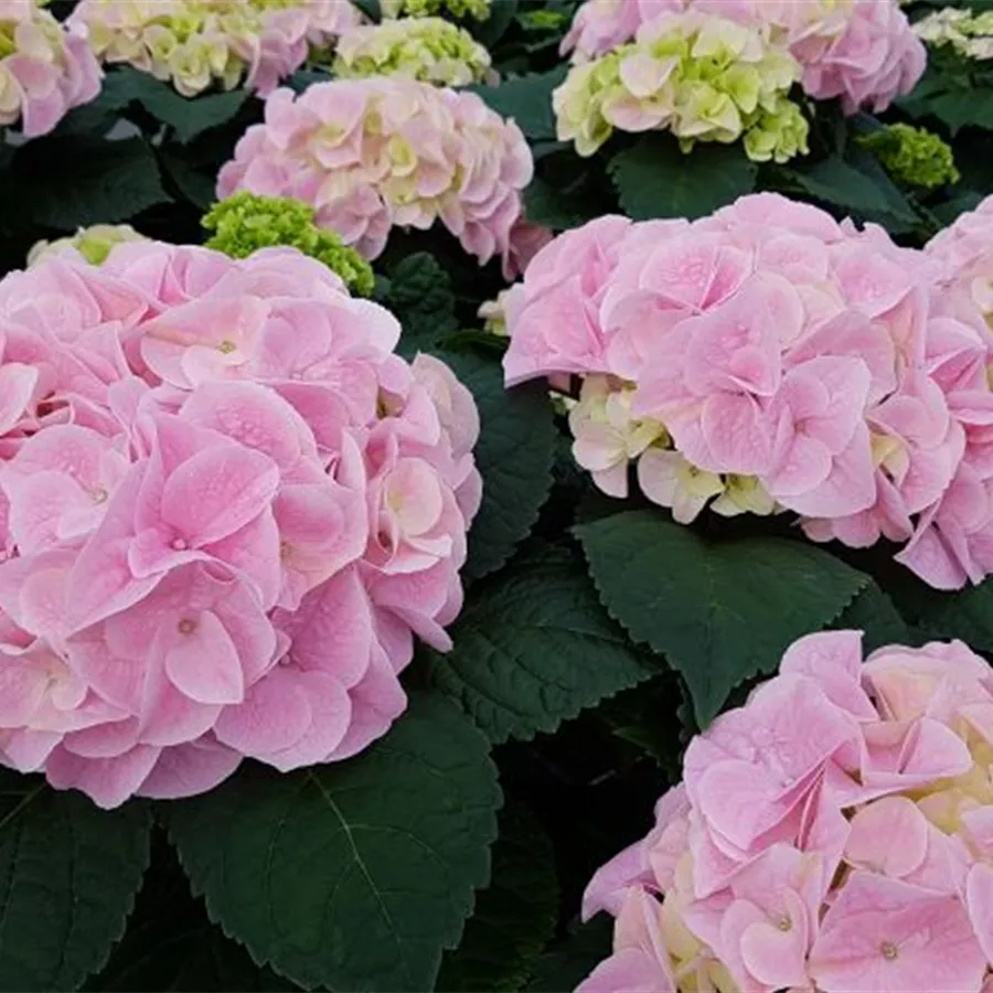 Die Bauernhortensie 'Sonnenstein'® aus der Züchtung SAXON® hat große ballförmige Blütenstände mit einzelnen großen Blüten, die sich im Aufblühen hellrosa bis porzellanrosa zeigen und von Juni bis Oktober blühen.