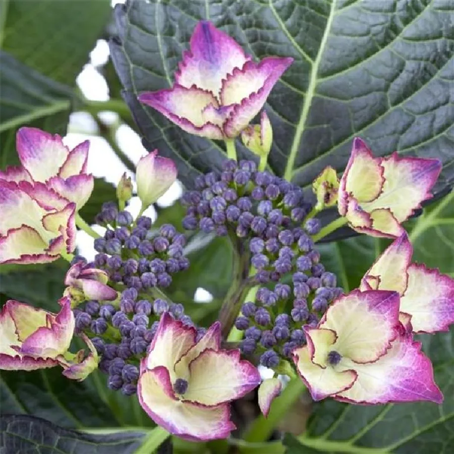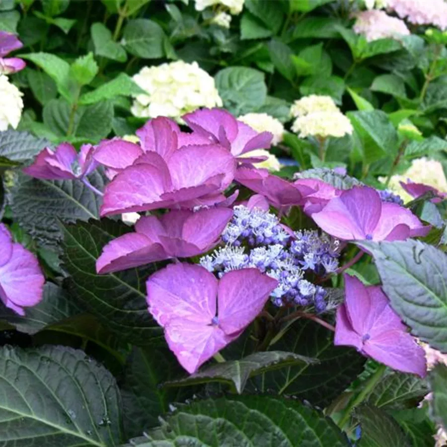 Die Tellerhortensie 'Dark Angel'® lila hat große tellerförmige Blütenstände, die sich innen weißlich und außen blau zeigen. Zum Herbst hin nimmt die Blüte eine grüne Färbung mit himmelblauer Schattierung an.
