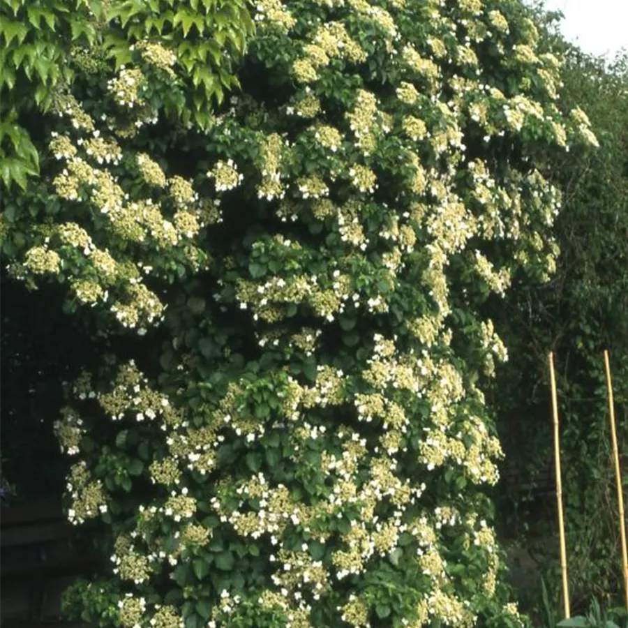 • Die Kletterhortensie nimmt sich gerne einige Jahre Zeit, bis sie ihre ersten, weißen, hübsch anzuschauenden Blüten präsentiert. Das Warten wird belohnt Ihre offenen und lockeren tellerförmige Trugdolden verströmen einen süßlichen Duft, der an Holunder und Jasmin erinnert. Lockt zahlreich Bienen, Hummeln und andere Insekte an.