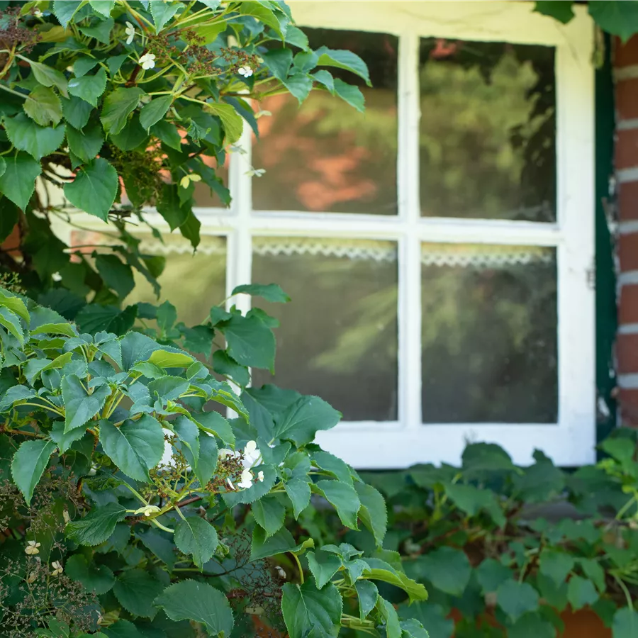 Die gewöhnliche Kletterhortensie bildet cremeweiße tellerförmige Trugdolden aus fruchtbaren (innen) und sterilen (außen) Blüten, die bis zu 15-20 cm schaffen. Blüht ab Juni.