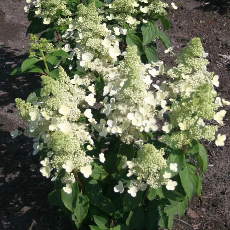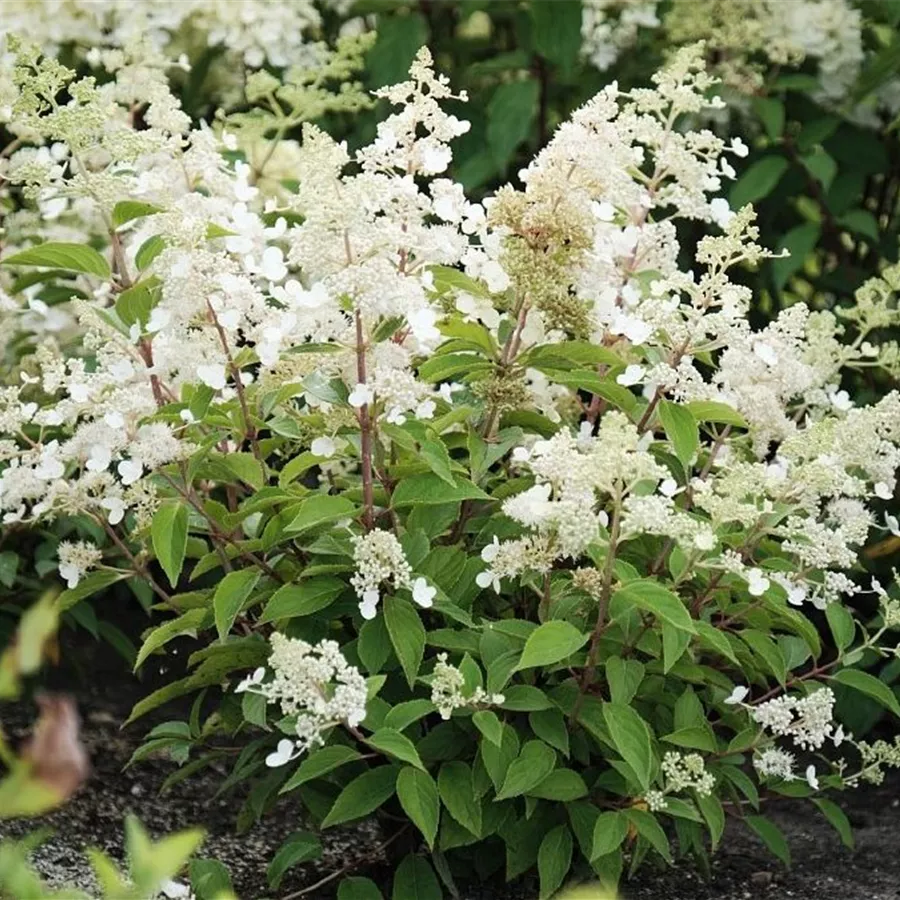 Die Rispenhortensie 'Magical Himalaya'® hat weiße Rispen, die sich gegen Ende des Sommers grünlich färben. Blüht von Juli bis Oktober.