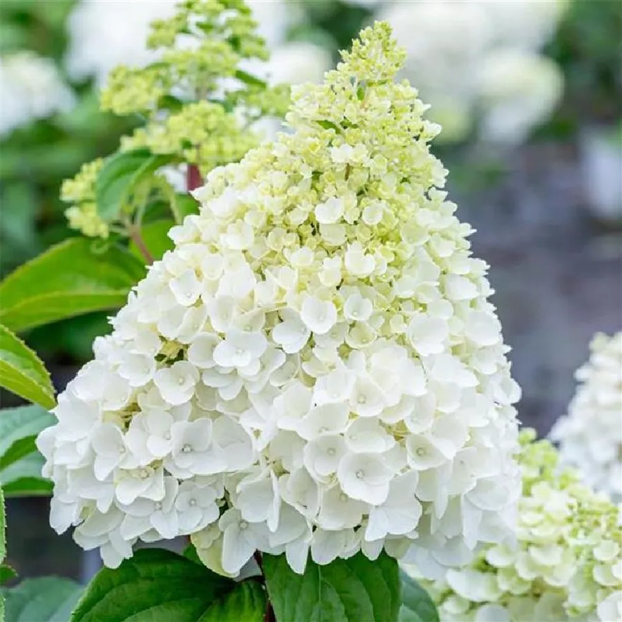 Die Rispenhortensie 'Magical Mont Blanc''® bildet große, spitz zulaufende Rispen aus. Im Aufblühen zeigt sie sich reinweiß. Im Laufe des Sommers verfärbt sich die Rispenspitze in ein Limettengrün und erinnert an schneebedeckte Berge. Blütezeit von Juli bis Oktober.