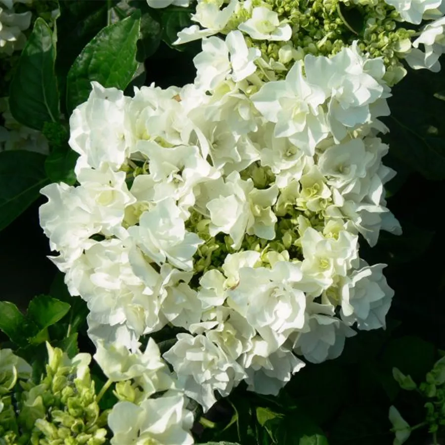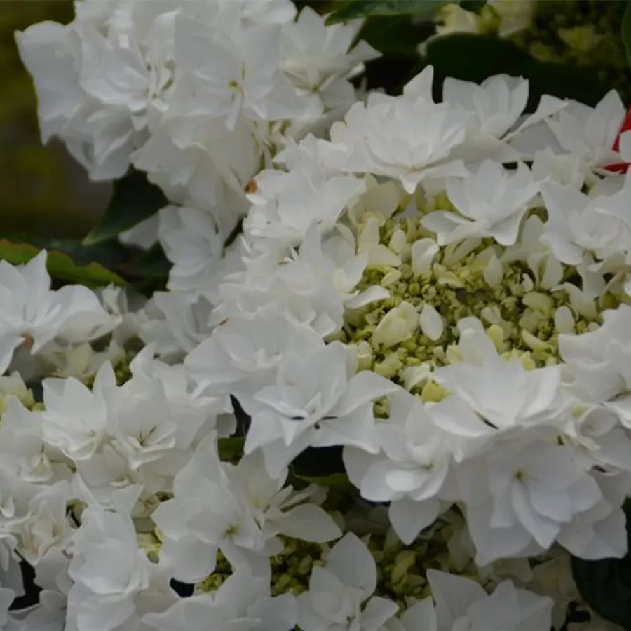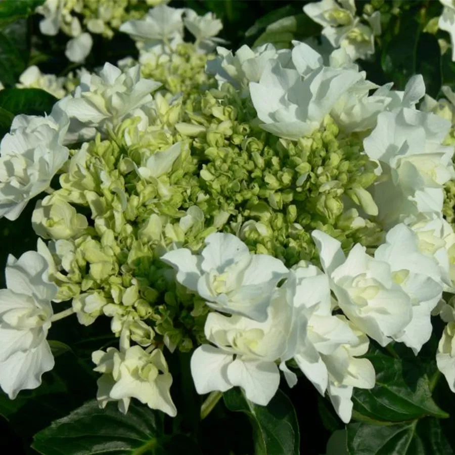 Reinweiße Hortensie mit doppelten Blüten, sie ist ebenso schnittverträglich wie die anderen Everbloom Sorten.Die Bauernhortensie 'Coco'® hat flache tellerförmige Blütenstände, die sich im Aufblühen grünweiß bis weiß zeigen und von Juni bis Oktober blühen. Die einzelnen Blüten sind gefüllt, rieseln nicht und sehen wie kleine doppelte Sterne aus. Zum Herbst hin nimmt die Blüte eine grünliche Tönung an.