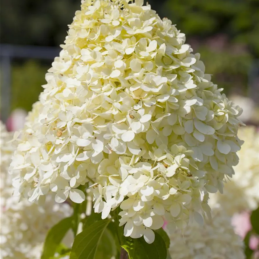 Ein Dauerrenner unter den Rispenhortensien, weiße Blüten mit einem Hauch von grün. Sehr stabiler Aufbau, riesige Blüten. Sollte wie alle Rispenhortensien jährlich im Frühjahr scharf zurückgeschnitten werden.Die Rispenhortensie 'Limelight'® bildet limonengelbe bis cremeweiße Rispen von Juli bis Oktober, die sich zum Herbst hin leicht rosa verfärben können. Kegelförmige Blütenstände bis zu 30 cm.