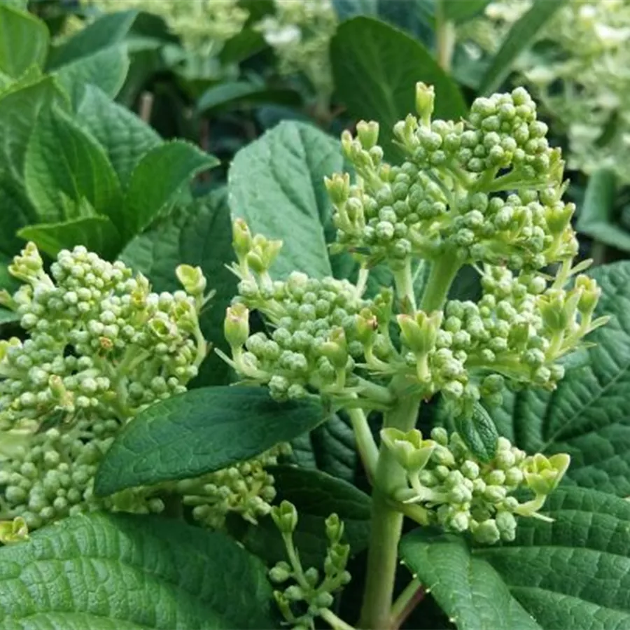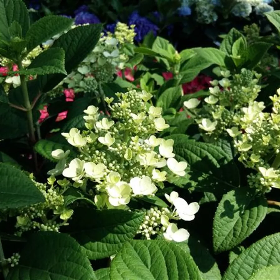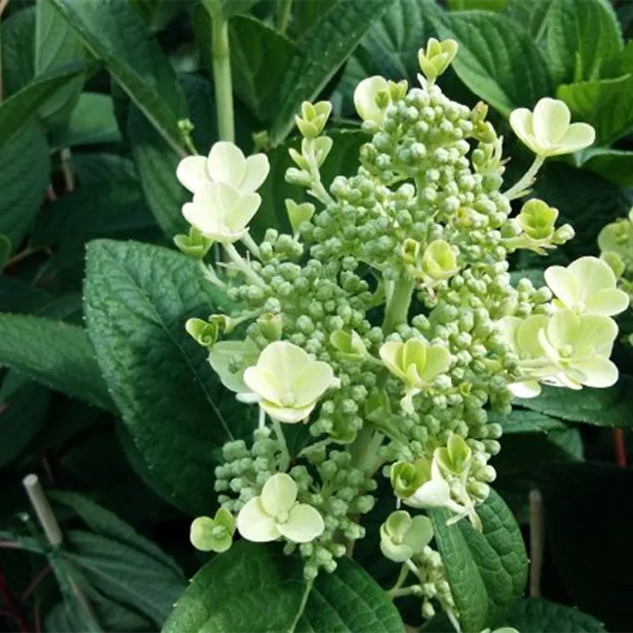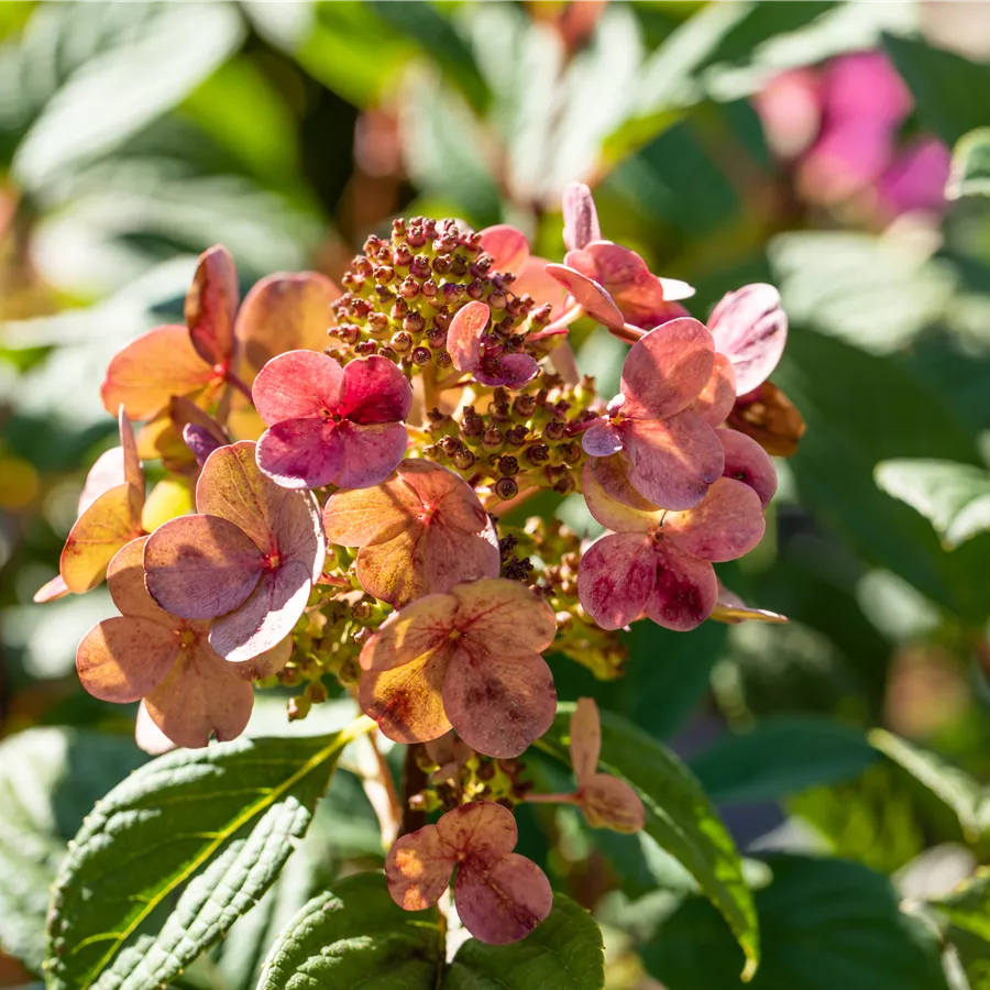 Die Rispenhortensie 'Little Quick Fire'® bildet kleine weiße rispenförmige lockere Blütenstände, die sich im Laufe der Zeit in ein schönes rosa bis rosarot verwandeln. Blütezeit von Juli bis Oktober.