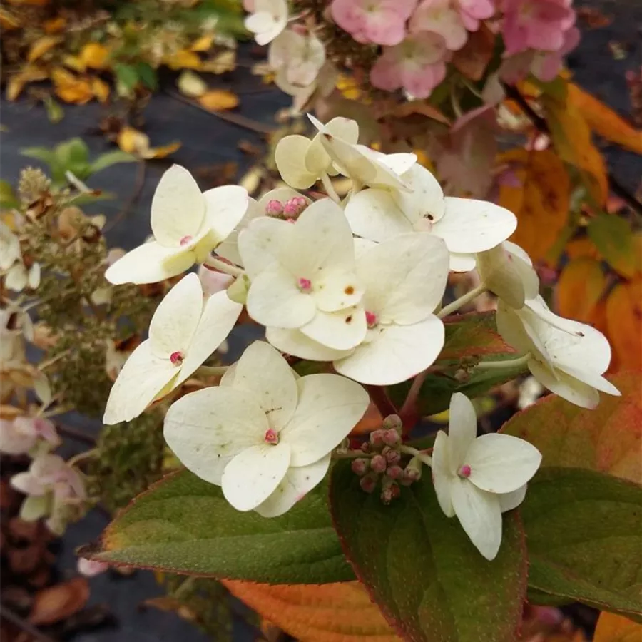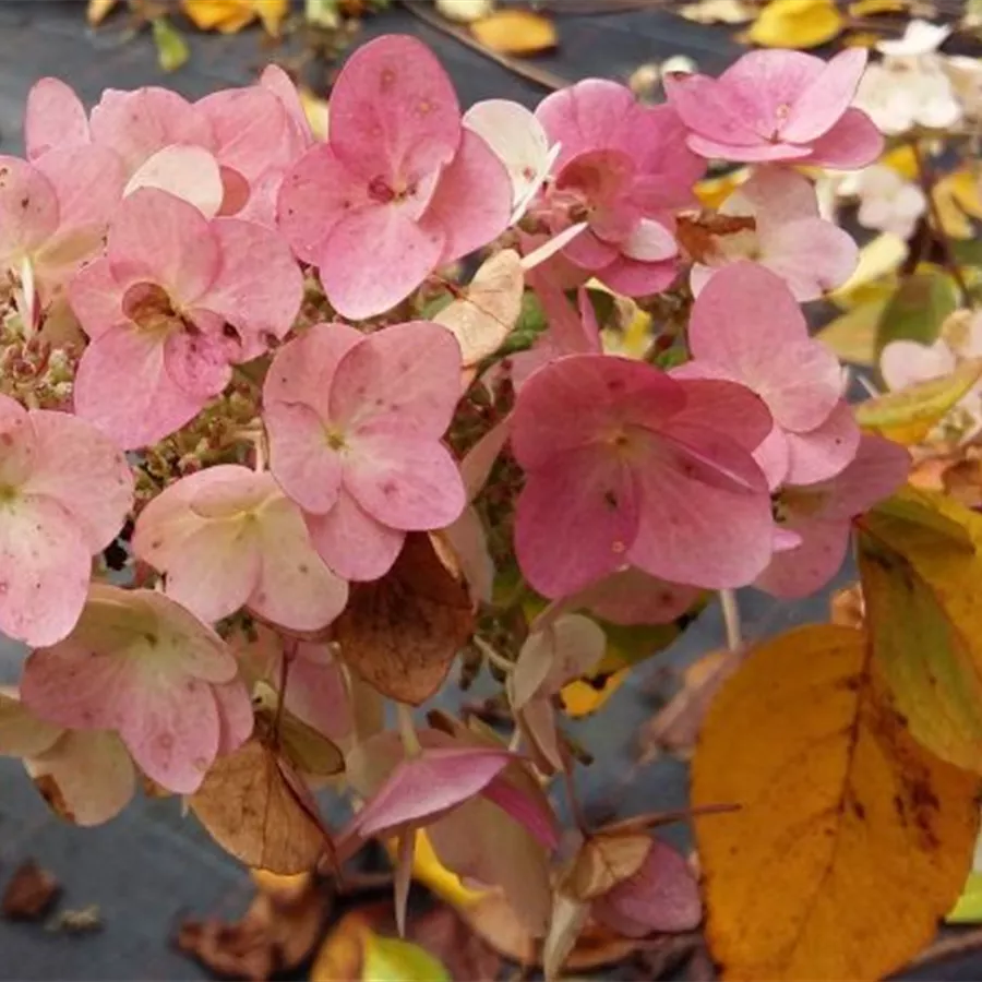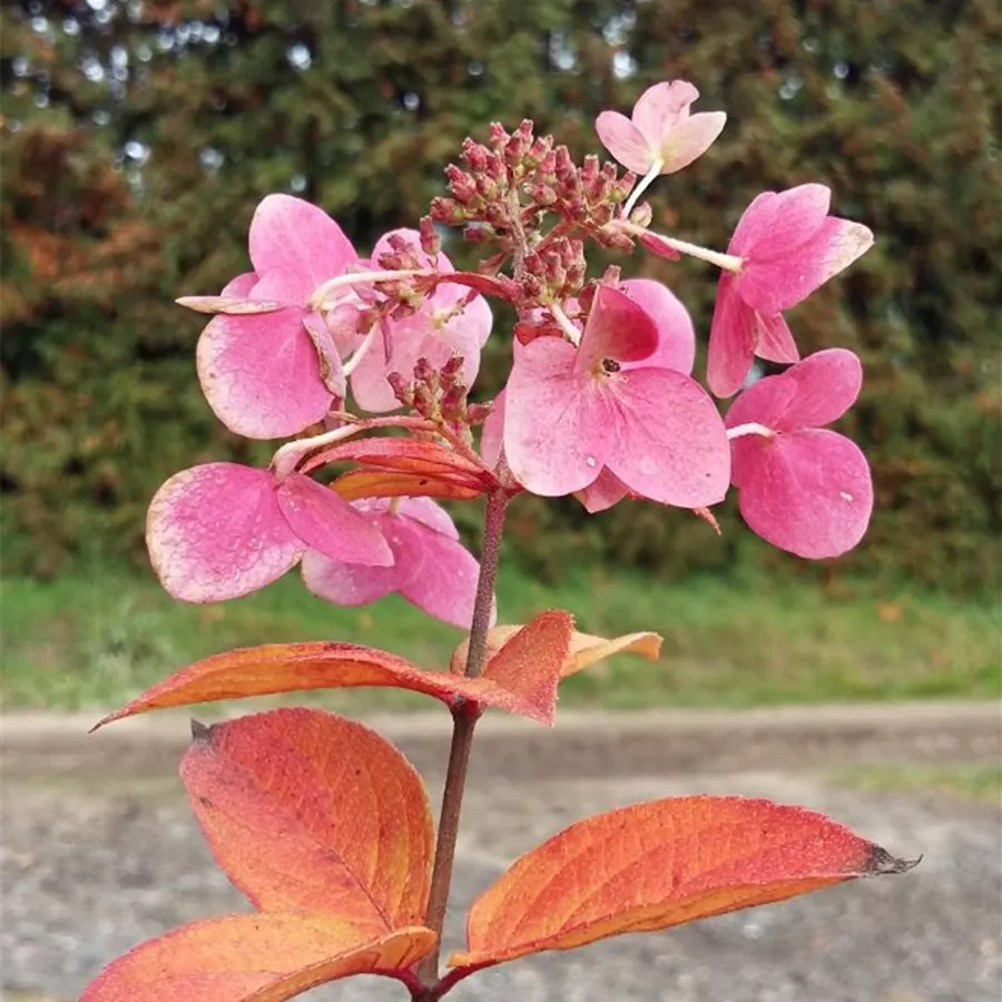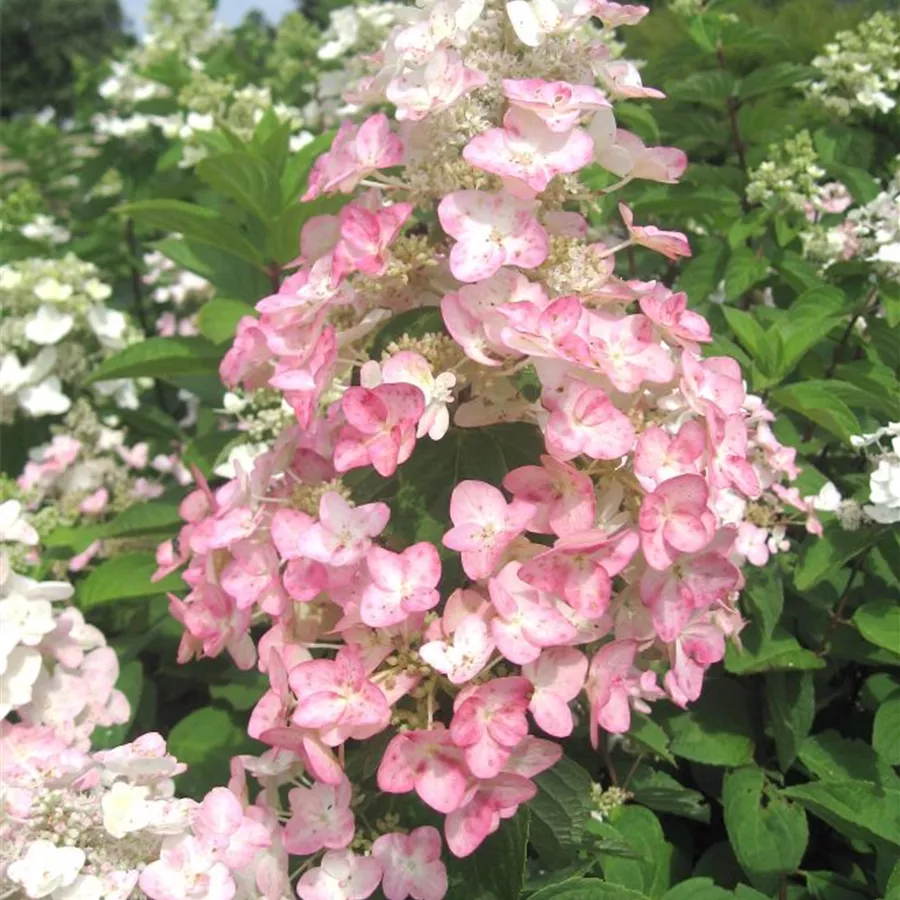 Intensives Farbenspiel strahlt auf starken Trieben.Die Rispenhortensie 'Mega Mindy'® zeigt ihre Pracht in lockeren aufrechten weißen Blütenständen, die sich über den Sommer bis zum Herbst von rosa bis dunkel rosarot färben. Blütezeit von Juli bis Oktober.