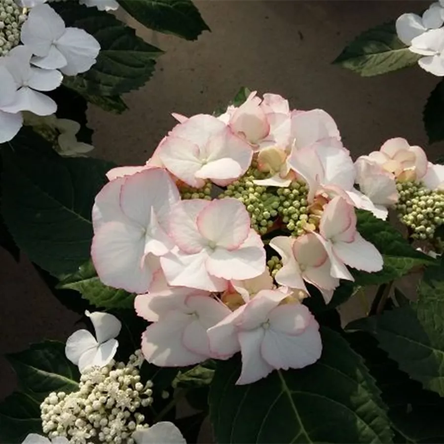 Die Bauernhortensie 'Frisbee'® Petticoat hat tellerförmige Blütenstände, die sich innen reinweiß und außen cremeweiß mit einem leichten, dezenten rosaroten Rand zeigen. Zum Herbst hin nimmt die Blüte eine grüne Färbung an. Blütezeit von Juni bis Oktober.