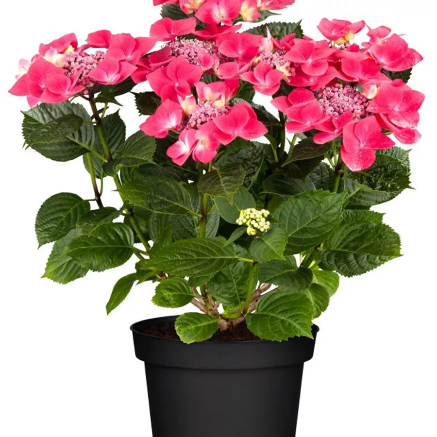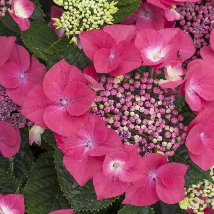 Rosarotes Blütenmeer trifft insektenfreundlichen Auftritt! Die Bauernhortensie 'Kardinal' hat große tellerförmige Blütenstände, die sich innen weißlich und außen kräftig rosarot zeigen. Zum Herbst hin nimmt die Blüte eine grüne Färbung mit hellrosa Schattierung an.