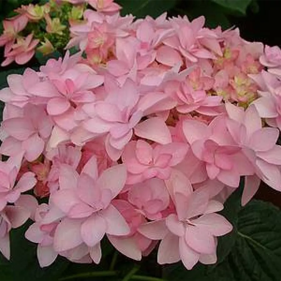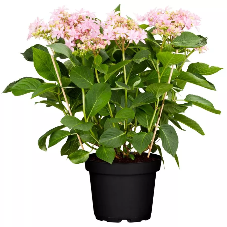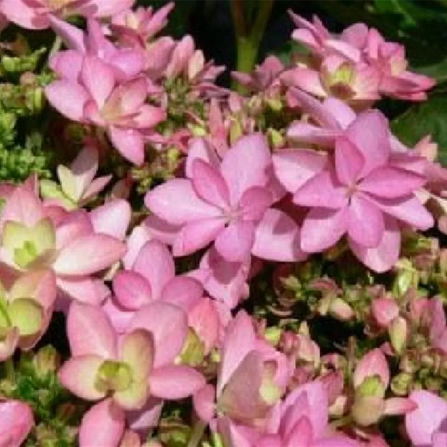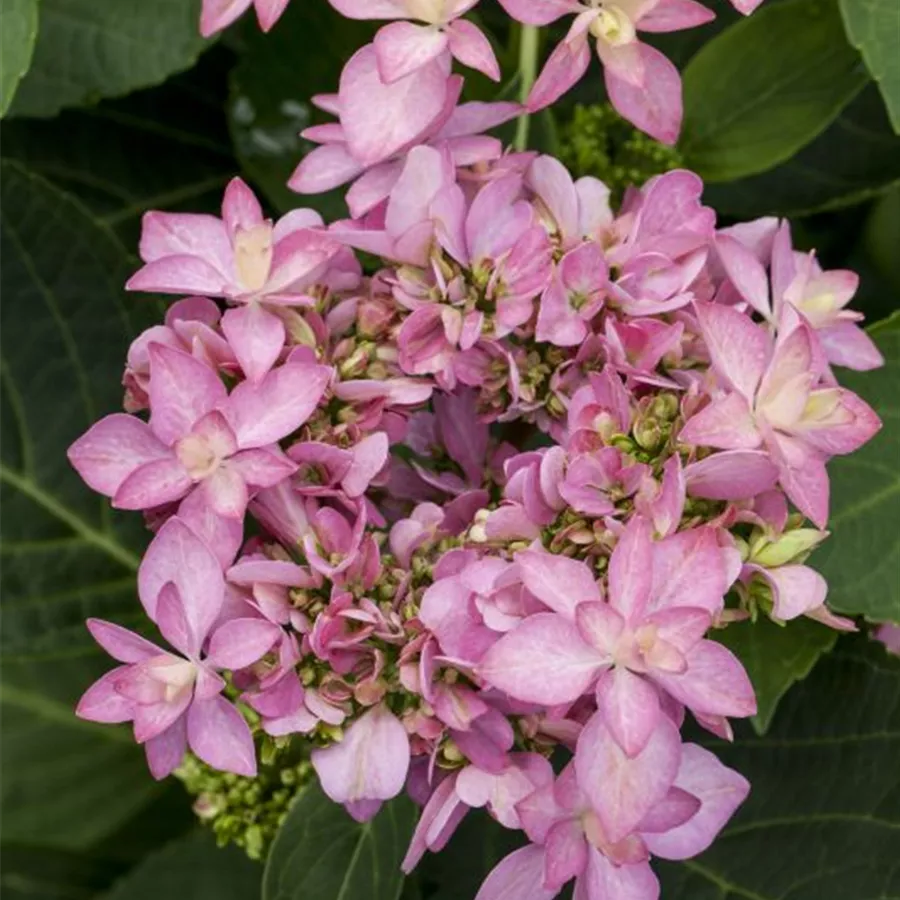 Die Bauernhortensie 'Romance' rosa von der Züchtung You&Me® hat flache, tellerförmige Blütenstände. Die einzelnen Blüten sind gefüllt, zugespitzt, rieseln nicht und sehen wie kleine Sternchen aus. Sie blühen zartrosa bis dunkelrosa. Zum Herbst hin verfärbt sich die Blüte rosagrün bis hellgrün. Bei einem langen, trockenen Herbst nimmt die Blüte eine zauberhafte schöne rosarote bis weinrote Färbung an. Blütezeit von Juni bis Oktober.